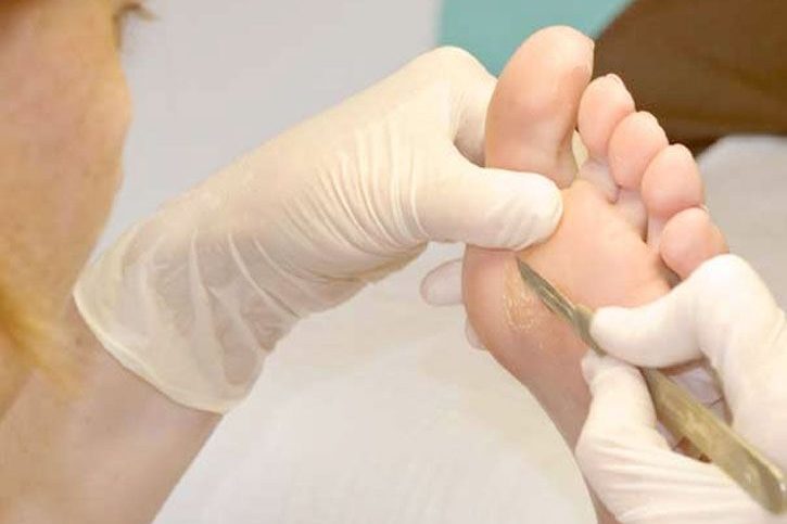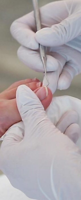 Slipning/klippning av naglar, rensning av nagelfals, slipning av hud, borttagning av förhårdnader, sprickor, borttagning av liktorn, nageltrång mm. Insmörjning. (Avlastning och även omläggning vid sår ingår.)